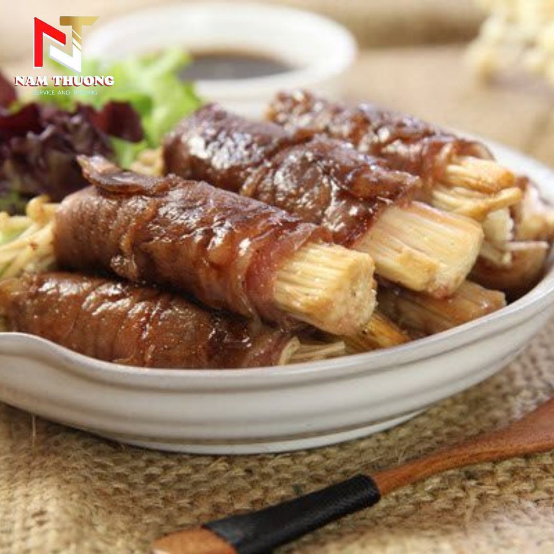 Ba chỉ bò cuộn nấm kim châm nướng than hoa.
