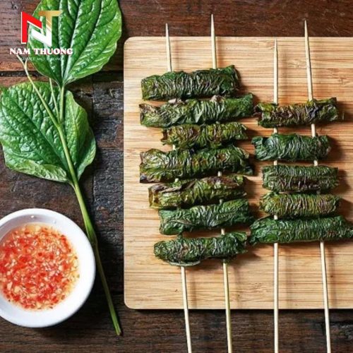 Trâu cuộn nướng than hoa, chấm muối ớt xanh.